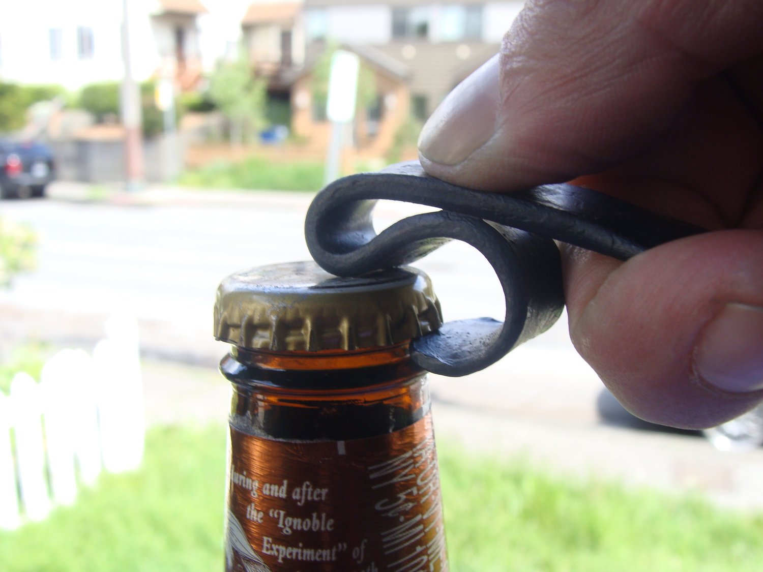 This hand-forged bottle opener keychain measures just 2 inches long and relies on simple physics to pry off bottle caps.